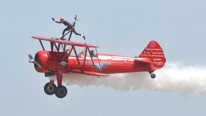 Depois de uma série de acidentes, estes “acrobatas sobre asas” são agora altamente regulamentados, mas a perigosa prática ainda possui alguns seguidores e muitos fãs. A acrobata Carol Pilon se exibe para a multidão no domingo 24 de agosto de 2014, durante o show aéreo Thunder in the Valley II no Aeroporto Regional de Waterloo, em Waterloo, Iowa, EUA