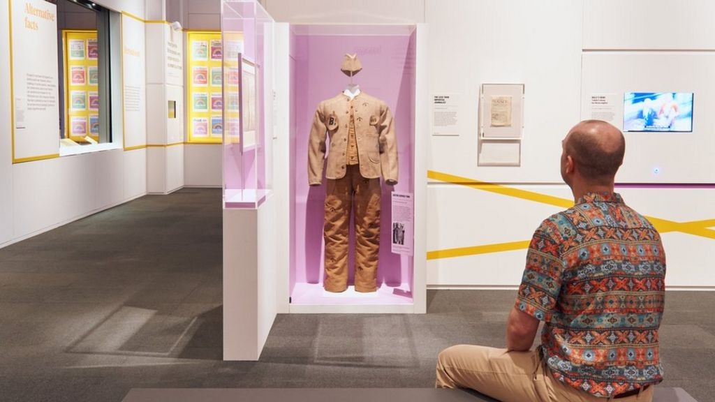 Entre as peças de uma exposição que explora os 500 anos de jornalismo no Reino Unido, um uniforme de prisioneiro se destaca em meio a jornais antigos e monitores modernos.