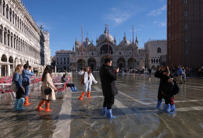 Alta da maré é comum nesta época do ano e é causada por uma combinação de fatores ambientais e do clima. Turistas usam galochas plásticas para visitar a Praça San Marco em Veneza em 5 de novembro de 2021