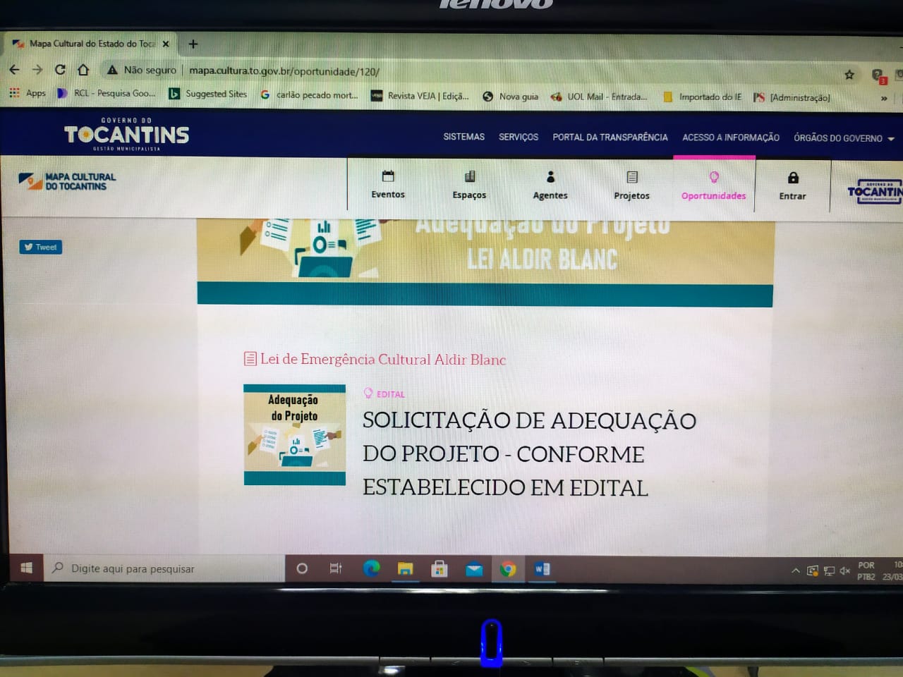 Os projetos aprovados pelos editais com recursos da Lei Aldir Blanc prejudicados pelas medidas de restrição voltadas ao controle da Covid-19 poderão passar por adequações. Os proponentes poderão solicitar as mudanças entre 24 de março e as 23h59 do dia 17 de abril, por meio da plataforma do Mapa da Cultura (http://mapa.cultura.to.gov.br/oportunidade/120/). Os interessados podem pedir mais informações por meio do Whatsapp (63) 99294-6010.