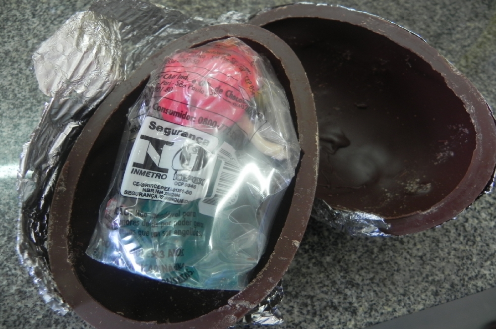 Muitos ovos de Páscoa são comercializados com brinquedos e é fundamental que na embalagem esteja estampada a seguinte frase: “ATENÇÃO: Contém brinquedo certificado no âmbito do Sistema Brasileiro de Avaliação da Conformidade”. O brinde deve, ainda, apresentar o selo do Inmetro.