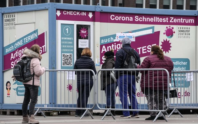 A partir de 1º de maio, pacientes com Covid-19 na Alemanha serão apenas aconselhados a manter isolamento por cinco dias. Exceção são profissionais da saúde e cuidadores. Pessoas esperam em fila para fazerem testes rápidos de antígeno de Covid-19 em Duisburg, na Alemanha, em 25 de janeiro de 2022