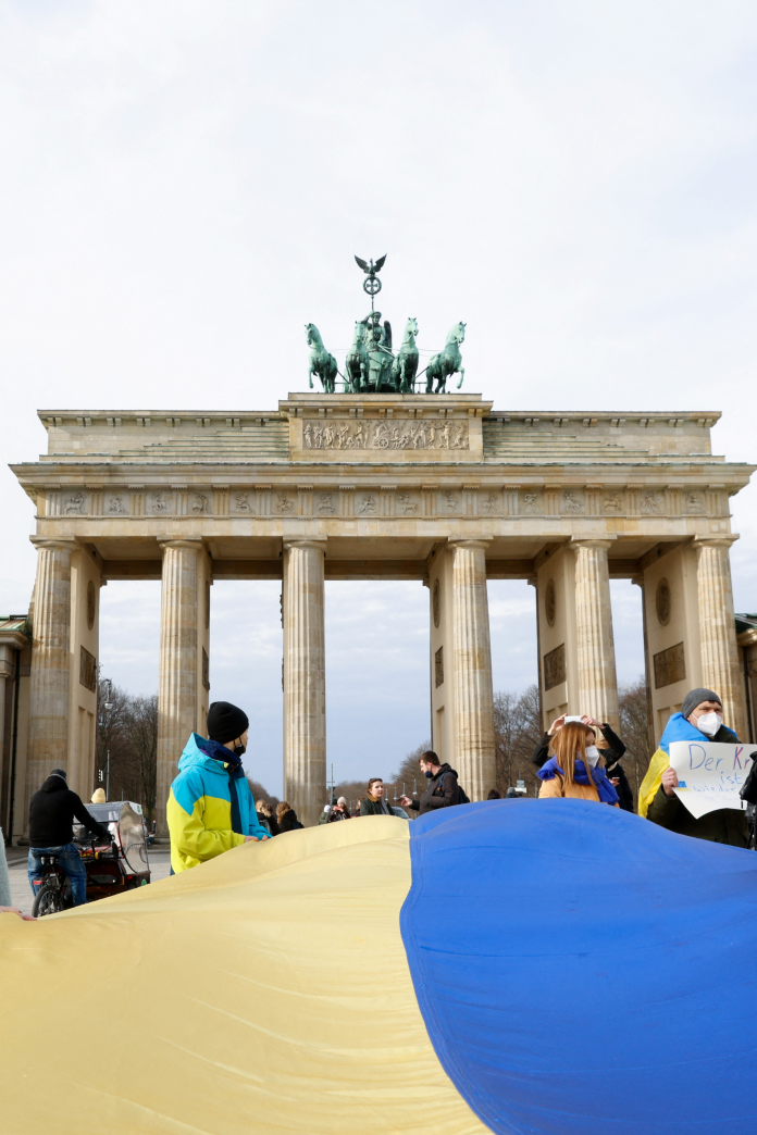Manifestantes alemães erguem bandeira ucraniana em protesto contra guerra, em Berlim, capital da Alemanha, nesta quinta-feira (24)