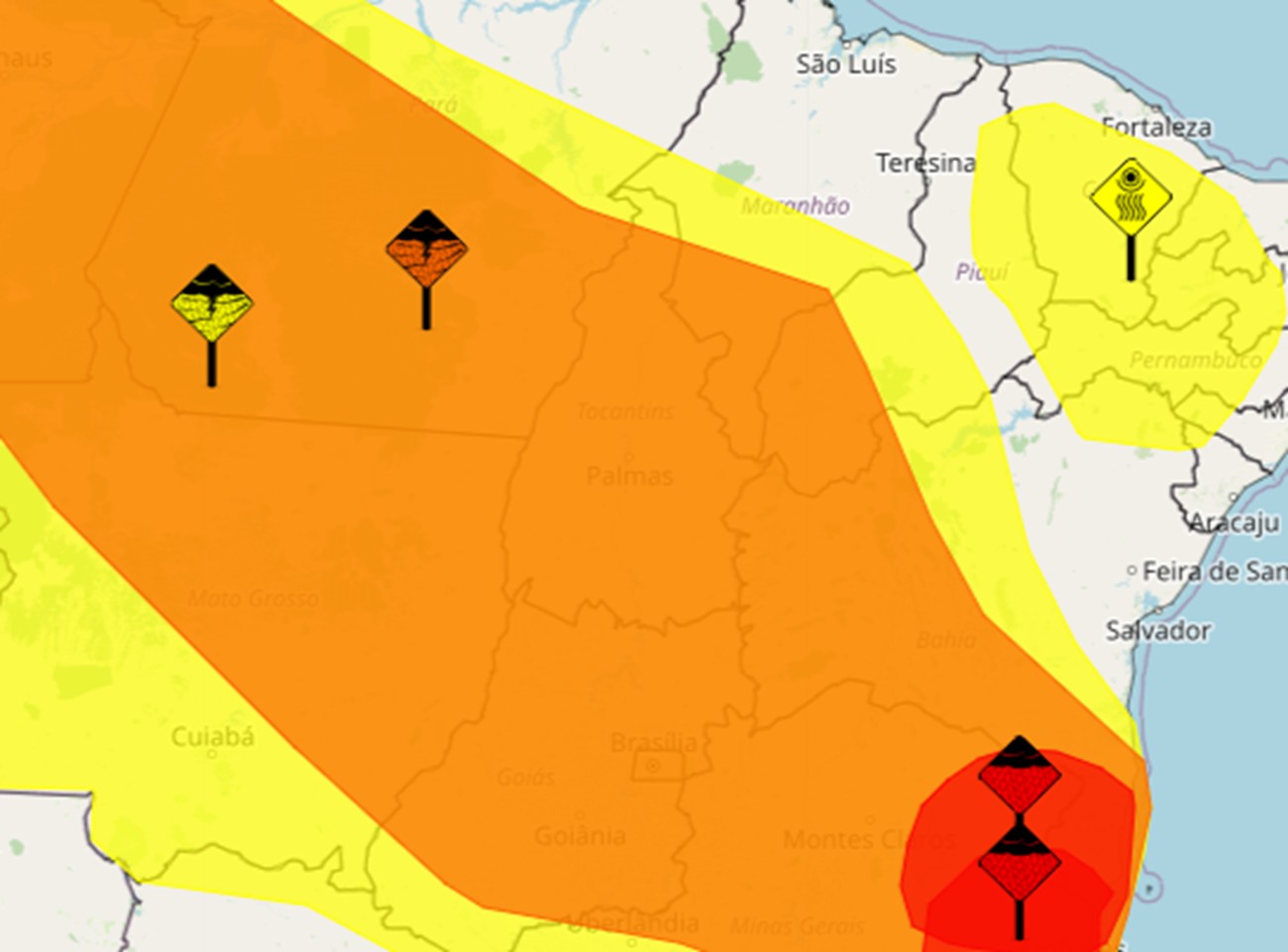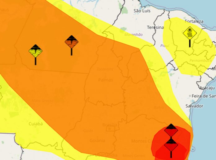 São dois avisos ativos: o primeiro com grau de severidade laranja, que significa “perigo”, cobre quase todo o estado e prevê um volume de chuva diário que pode chegar até 100 milímetros em um dia. O segundo, de nível amarelo, cobre o Bico do Papagaio.