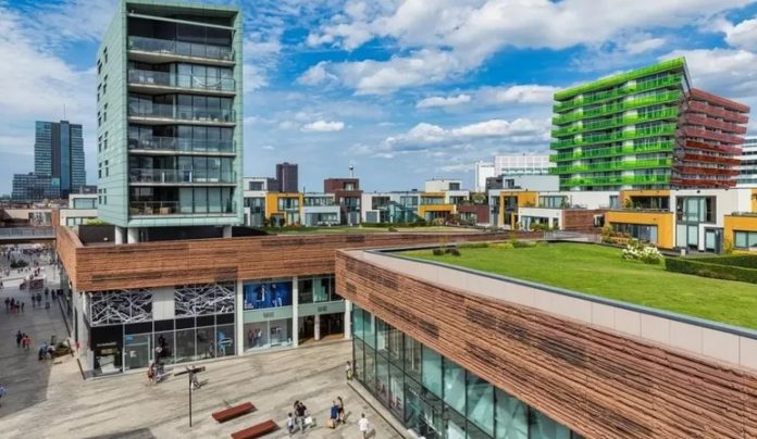 O projeto de três níveis foi finalizado com uma camada superior de espaços verdes plantados nos telhados das construções a nível do solo, como casas e pequenos blocos de apartamentos.