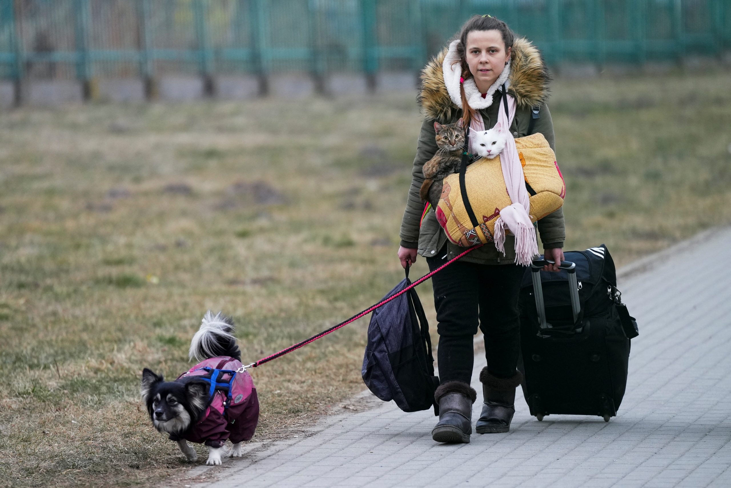Bichos também sofrem com a guerra. Muitos donos fazem o possível para salvá-los. Uma mulher caminha com dois gatos e um cachorro após cruzar a fronteira da Ucrânia para a Polônia para fugir da invasão russa neste domingo (13)
