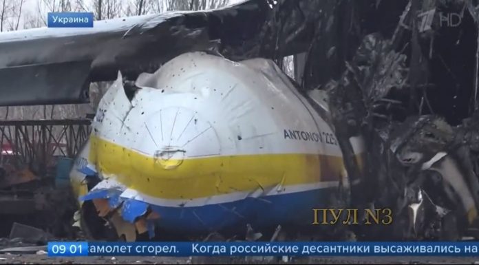 Avião Antonov An-225 Mriya é visto destruído no aeroporto Hostomel, perto de Kiev, na Ucrânia. Aeronave era o maior avião do mundo