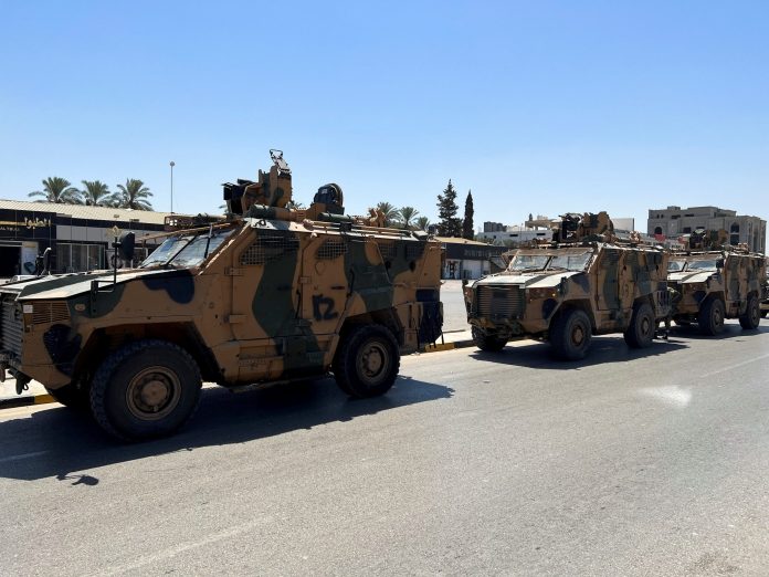 Impasse entre dois grupos armados divergentes se estende desde esta sexta-feira (26). Veículos militares aparecem alinhados em rua da Líbia