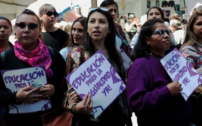 O caso da boliviana retomou o debate entre aqueles que opinam que ela deve abortar e os que se opõem, como o arcebispado de Santa Cruz, a vítima mora. Mulheres carregam cartazes com a frase ‘educação por igualdade já’ em celebração ao Dia Internacional da Mulher, em La Paz, na Bolívia, em 2019