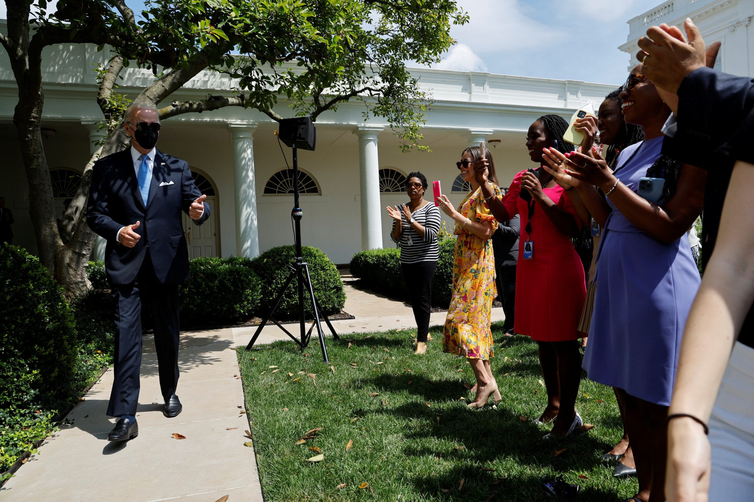 Presidente dos EUA, Joe Biden, é recebido por funcionários e pela imprensa no jardim da Casa Branca após sair de isolamento por causa da Covid-19
