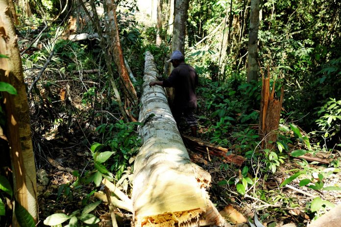 Foram 1.062 km² sob alerta de desmate na região. É o quarto mês consecutivo em que os índices batem recordes históricos mensais; primeiro semestre teve a maior área sob alerta em 6 anos. Foto mostra homem medindo árvore depois de cortá-la em Itaituba, oeste do Pará, no dia 7 de agosto de 2017.