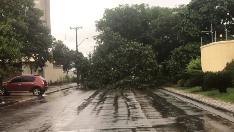 A interdição é na alameda 01 da quadra. As imagens mostram que a árvore que estava plantada em uma calçada foi arrancada perto da raiz. Por causa do bloqueio, os motoristas que passarem na região devem escolher outras rotas até que o serviço de recolhimento de galhadas seja finalizado.