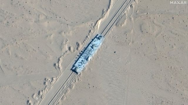 Uma das imagens, capturada pela empresa de tecnologia espacial norte-americana Maxar, mostra uma estrutura em forma de porta-aviões militar colocada em trilhos de trem.