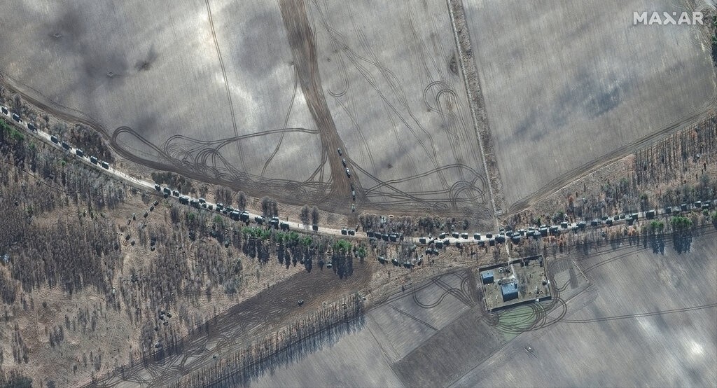 Segundo ele, imagens de satélite mostram comboios terrestres das forças russas se aproximando da cidade. As tropas russas viajam em um comboio militar que se estende por pelo menos 27 quilômetros.