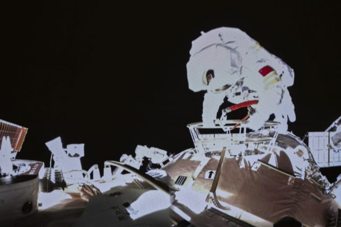 A astronauta e um colega, Zhai Zhigang, deixaram o módulo principal da estação, o Tianhe, na noite de domingo, passando mais de seis horas do lado de fora instalando equipamentos e realizando testes ao lado do braço de serviço robótico da estação, de acordo com a Agência Espacial Tripulada da China.