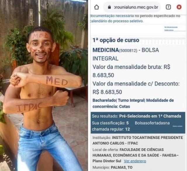Luiz Gustavo, que já trabalhou como office boy, garçom, empacotador e, por último, como atendente de farmácia, foi aprovado em 5º lugar para medicina em uma faculdade particular onde a mensalidade do curso custa R$ 8.863. O estudante conseguiu uma bolsa integral pelo Prouni e, por isso, não terá que arcar com esse custo.