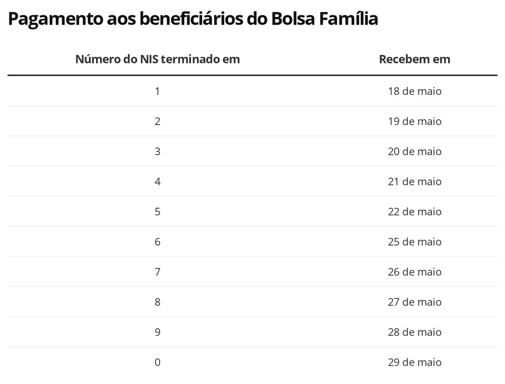 2.Calendário para pagamento aos beneficiários do Bolsa Família