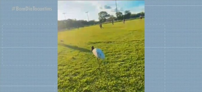 Pássaro símbolo do pantanal passa por campo de futebol e chama atenção de moradores