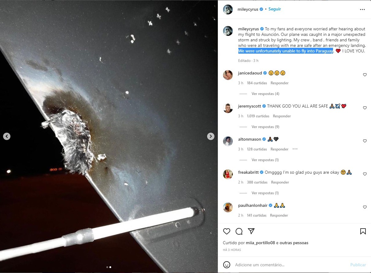 Avião em que Miley Cyrus viajava para o Paraguai é atingido por raio