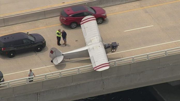 Avião de pequeno porte fez pouso de emergência em uma ponte de Ocean City, em Nova Jersey, nos EUA. Foto de 19 de julho de 2021