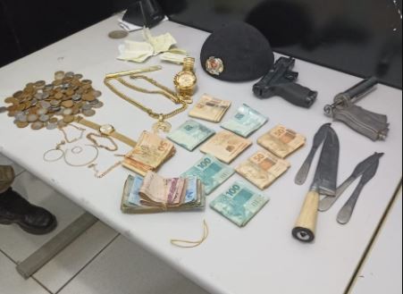 Segundo a PM, os dois homens presos têm ficha criminal considerada extensa. Eles não tiveram os nomes divulgados e têm 46 e 36 anos. O veículo roubado também estava com a dupla, assim como uma quantia de mais de R$ 9 mil em espécie, algumas joias e armas.