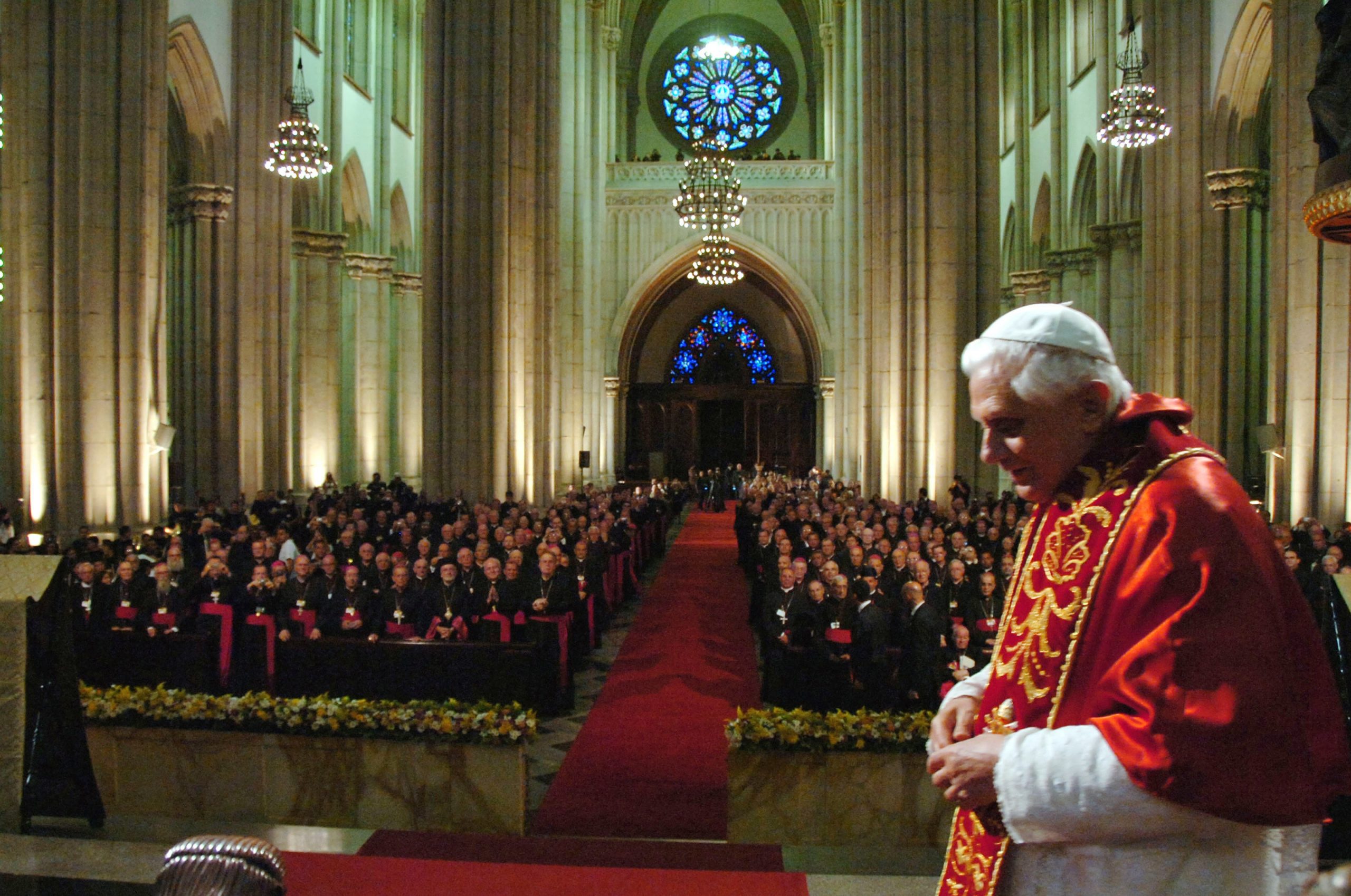 Papa emérito foi acusado recentemente de ter acobertado casos de pedofilia na época em que era arcebispo. Bento XVI se encontra com bispos na Catedral da Sé, na região central de São Paulo, em 11 de maio de 2007