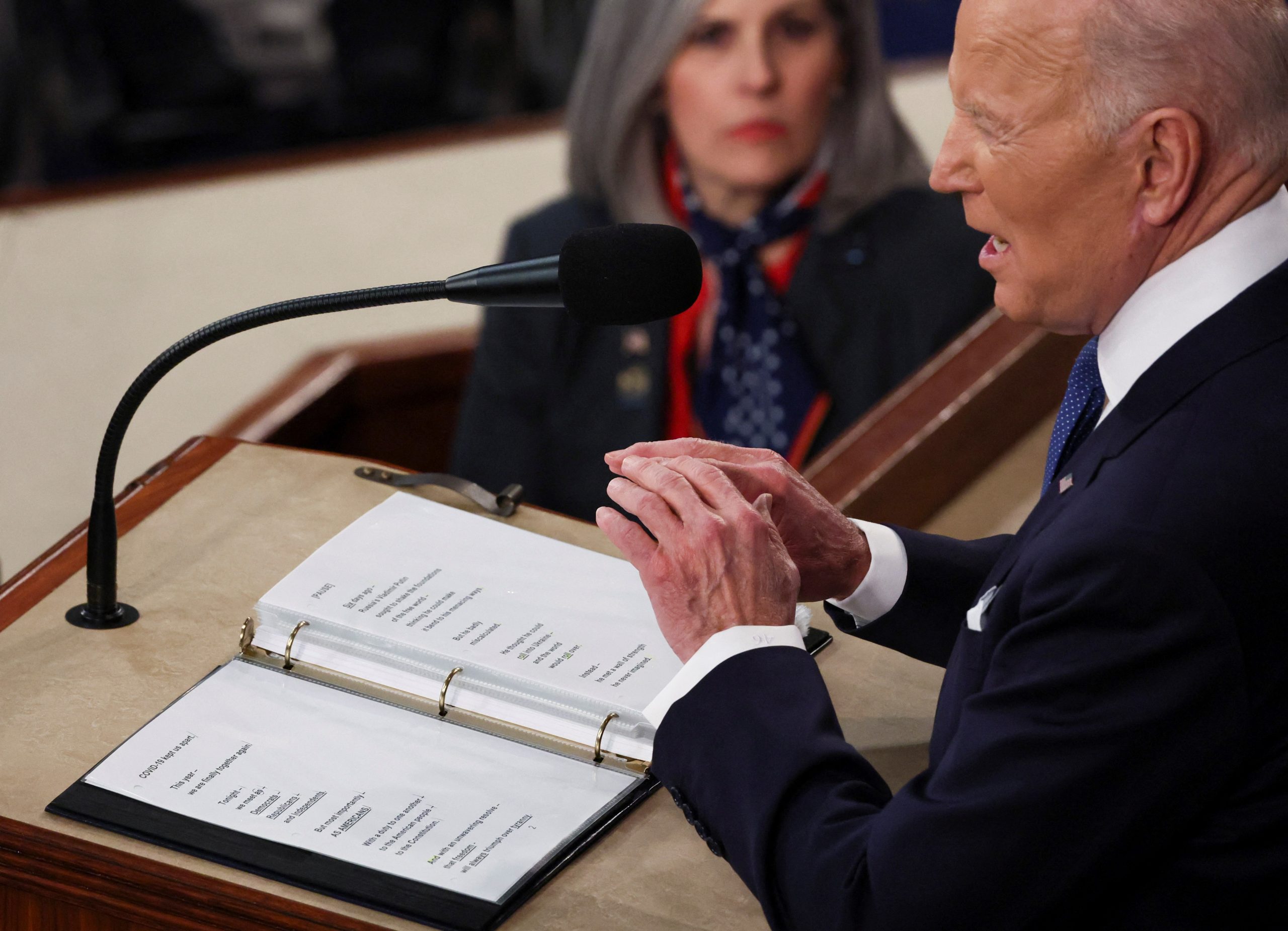 “Seis dias atrás, o russo Vladimir Putin procurou abalar as fundações do mundo livre pensando que poderia fazê-lo se curvar aos seus caminhos ameaçadores. Mas ele calculou mal”, atestou o presidente americano. Congressistas estavam sem máscaras, vestiam azul e amarelo ou portavam bandeirinhas para homenagear a Ucrânia.