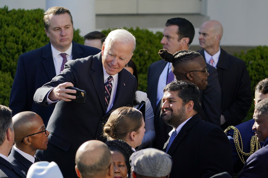 Biden tira foto com convidados em evento de promulgação de lei contra o linchamento nos EUA em foto de 29 de março de 2022
