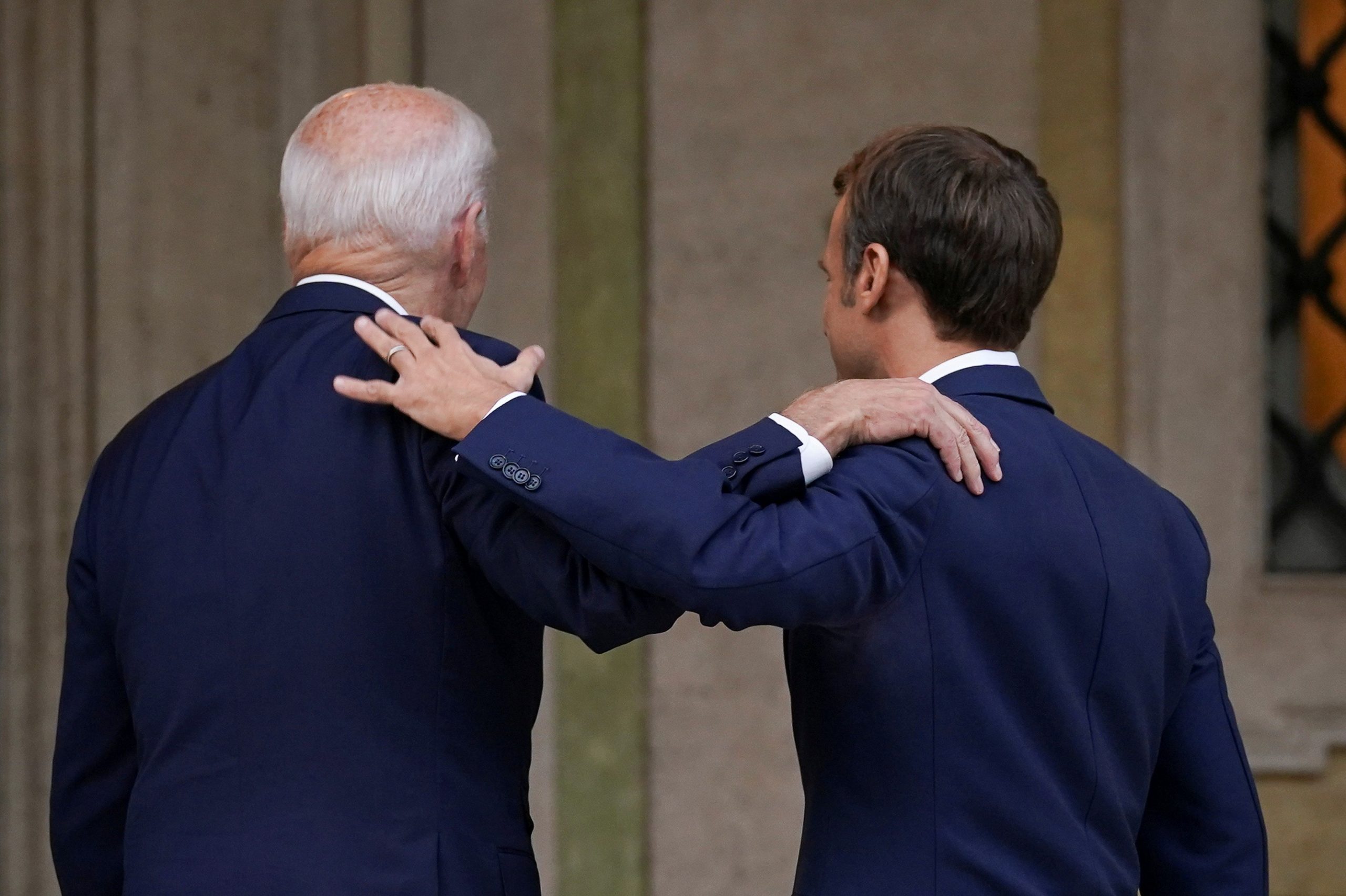 Biden afirmou que tinha a impressão de que os franceses sabiam que os americanos trabalhavam para serem contratados pela Austrália. Joe Biden e Emmanuel Macron no Vaticano, em 29 de outubro de 2021
