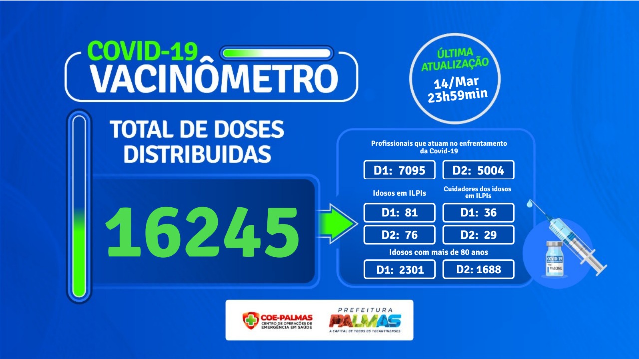 Em Palmas foram vacinadas 16.245 pessoas, sendo 9.477 de primeira dose e 6.768 de segunda dose. A vacina prioriza os profissionais que trabalham na linha de frente contra a Covid-19 e Idosos, grupos estabelecidos pelo Ministério da Saúde e constantes no Plano Municipal de Vacinação.