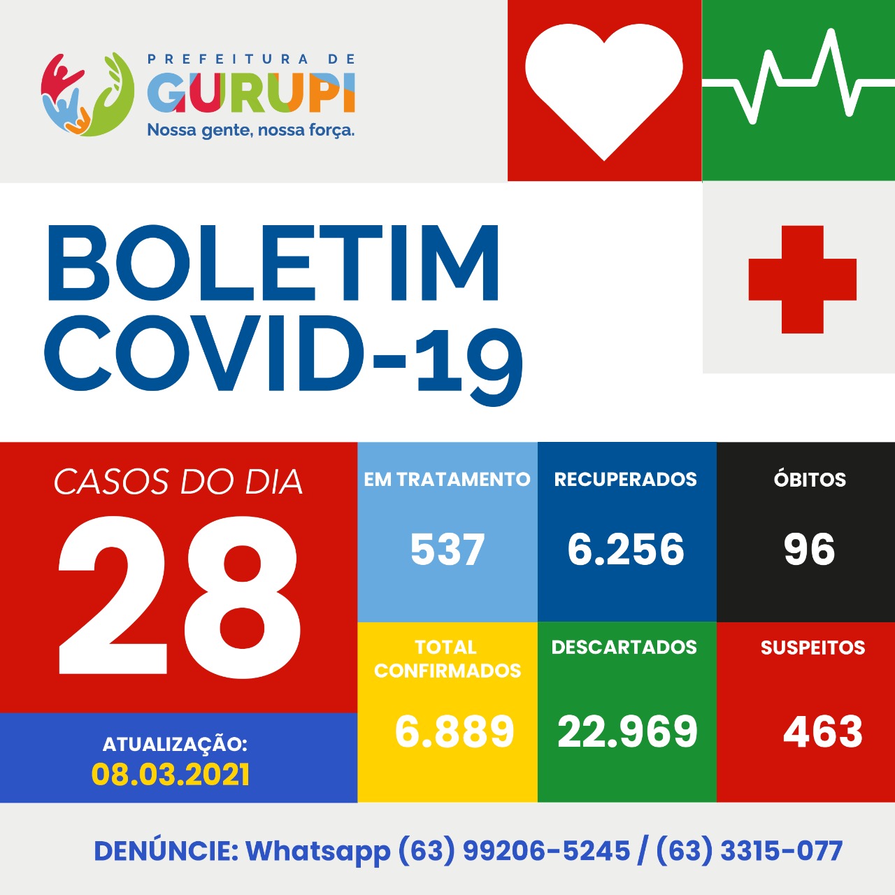 Gurupi contabiliza nesta segunda-feira, 22.969 casos descartados; 463 casos suspeitos; 6.889 confirmados, destes: 6.256 (90,8%) pessoas estão recuperadas, 537 (7,8%) estão em tratamento, e 96 (1,4%) vieram a óbito.