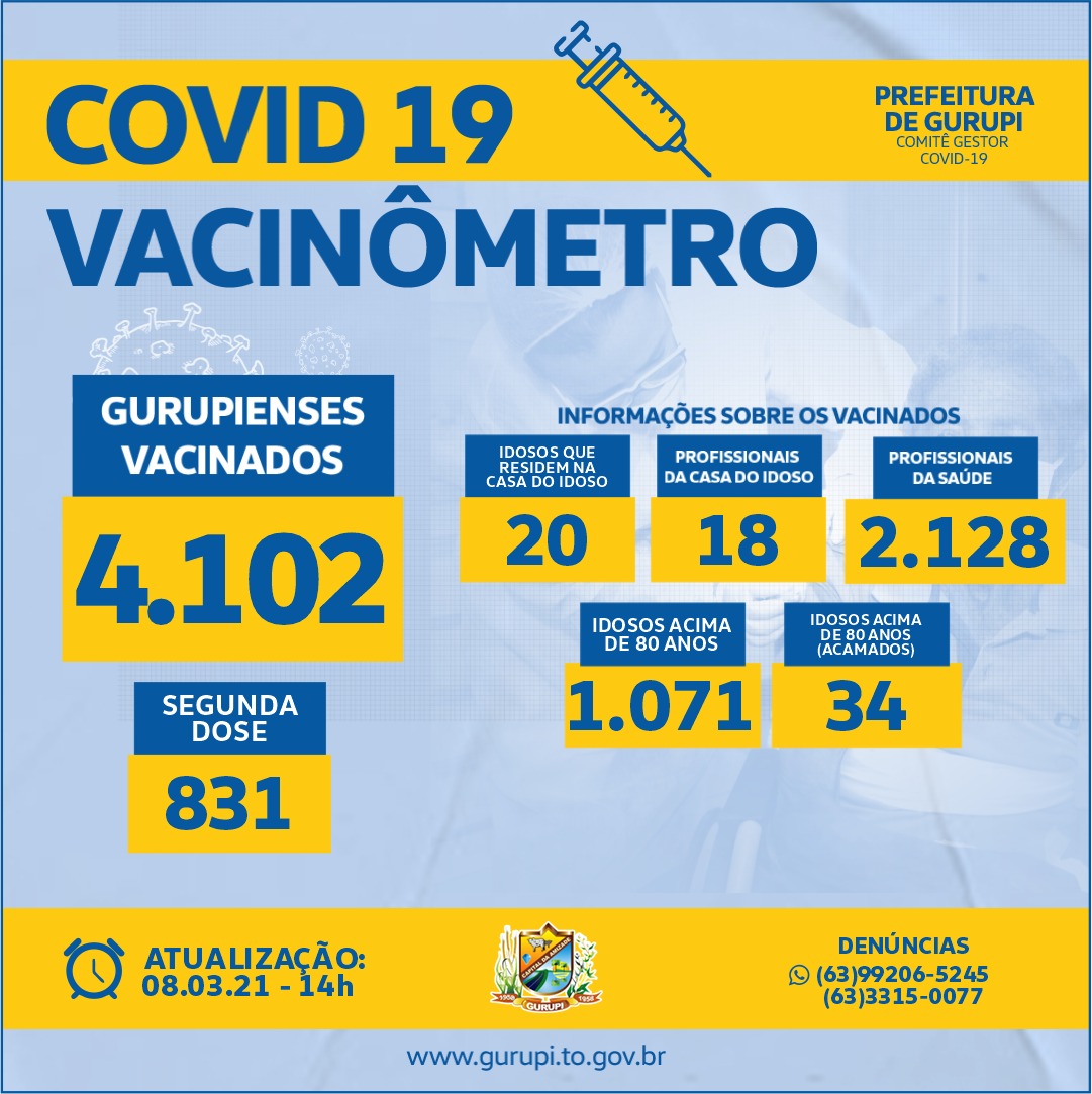 Até às 14h desta segunda-feira a coordenação de imunização da Secretaria Municipal de Saúde de Gurupi informou que 4.102 pessoas já foram vacinadas.