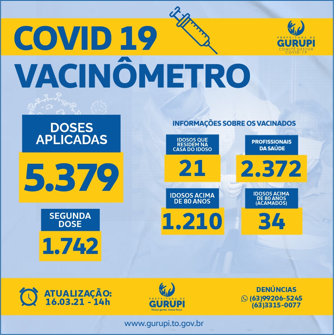 Até às 14h desta terça-feira, a coordenação de imunização da Secretaria Municipal de Saúde de Gurupi informou que 5.379 pessoas já foram vacinadas.