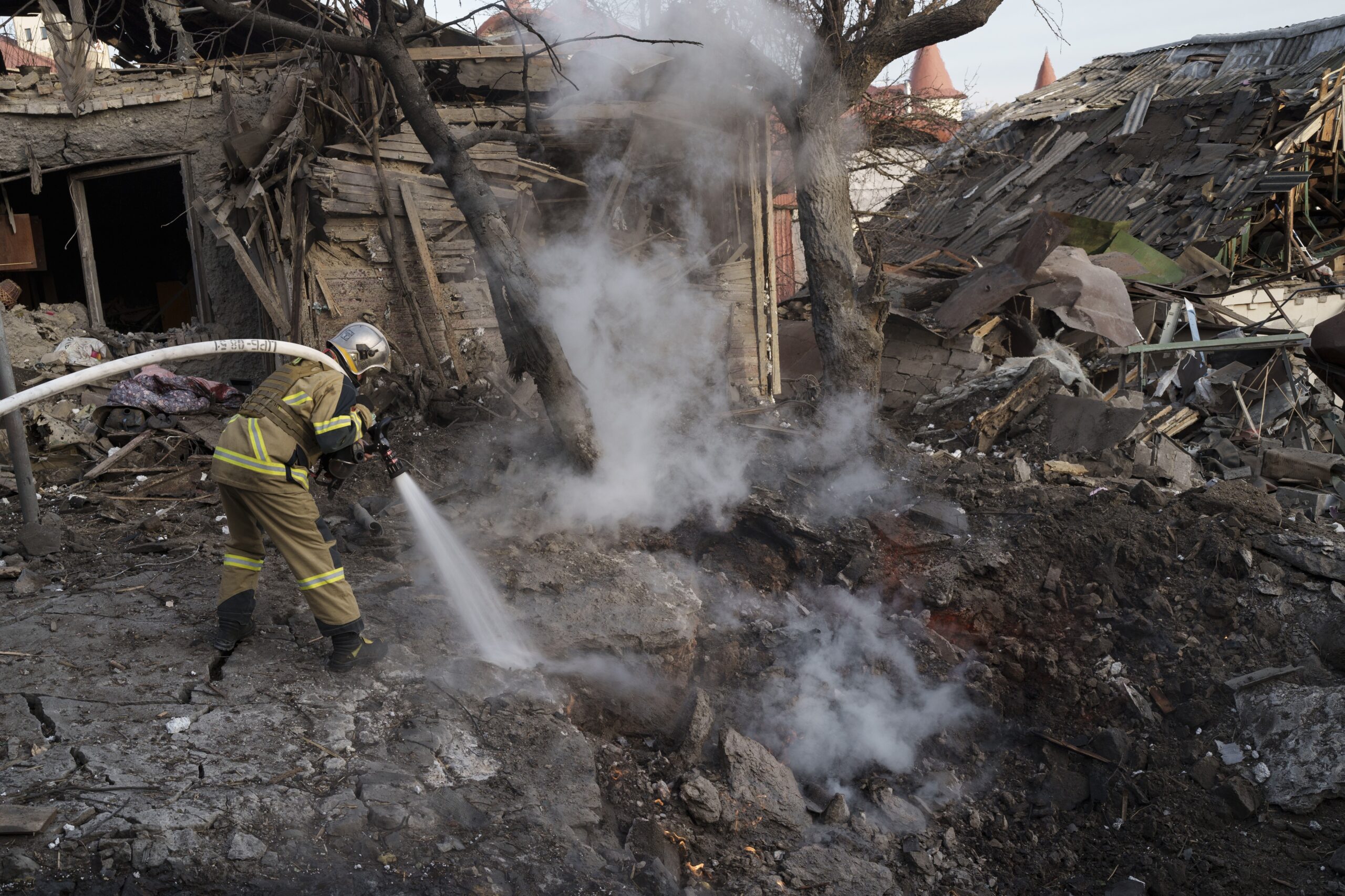 Um membro da equipe de resgate de Kiev passa diante de destruição causada por bombardeios russos na capital ucraniana