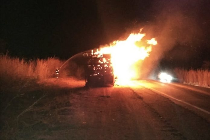 O reboque de uma carreta rodotrem e a carga de toras de madeira de eucalipto ficaram praticamente destruídos com a ação do fogo na madrugada desta quarta-feira, 08, na zona rural de Paraíso do Tocantins. Os bombeiros militares da 3ª Companhia atuaram por horas no controle das chamas, à beira da Rodovia BR-153.