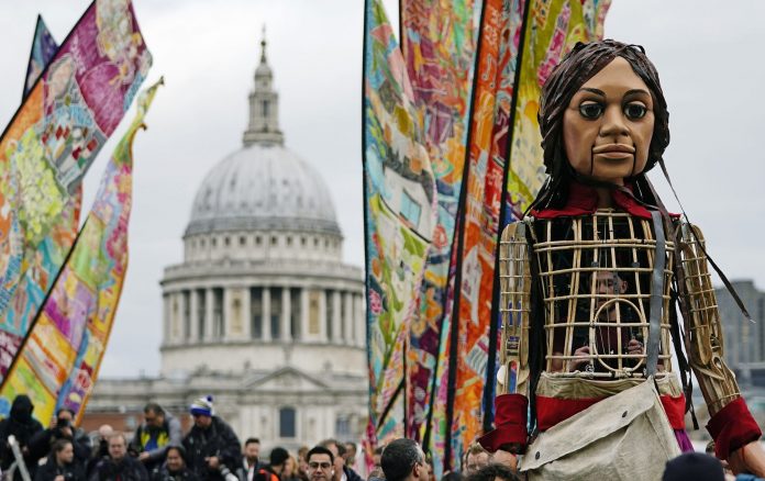 A Pequena Amal, um fantoche gigante que representa uma menina síria refugiada, chegou neste sábado (23) à Catedral de São Paulo, em Londres.