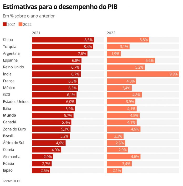 Em outubro, foi a vez de o Fundo Monetário Internacional (FMI) revisar suas projeções de crescimento para os países até o fim de 2022. De acordo com o FMI, a economia global deve registrar alta de 5,9% em 2021 e 4,9% em 2022. Os números, novamente, são superiores ao crescimento projetado pela instituição para o Brasil: 5,2% e 1,5%, respectivamente.