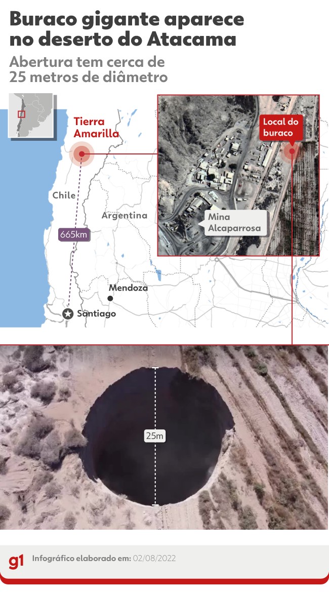 Buraco apareceu no deserto do Atacama, em área de mineração, no final de julho. Presidente do Chile visitou o local. Buraco gigante aparece no Atacama, no Chile