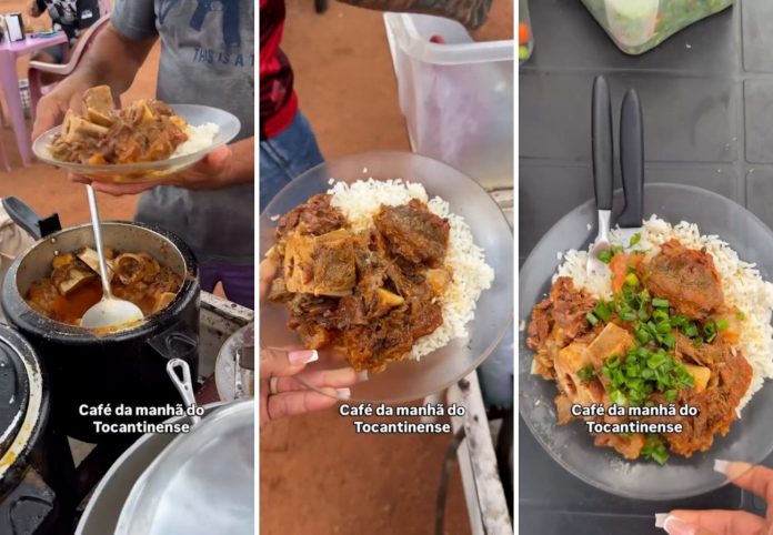 Chambari é um prato típico e consumido até no café da manhã pelos tocantinenses. Acompanhado de arroz, cheiro-verde e pimenta, os trabalhadores acreditam que a combinação garante “sustância” e até cura ressaca. Nas redes sociais, um vídeo viralizou ao mostrar a comida sendo vendida às margens da BR-153, em Nova Olinda, no norte do Tocantins.
