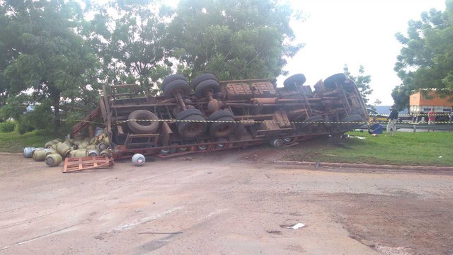 O veículo de carga tombou no canteiro central da pista. Imagens feitas no local mostram que o compartimento do caminhão foi danificado e vários botijões caíram no chão. O trânsito não foi prejudicado.