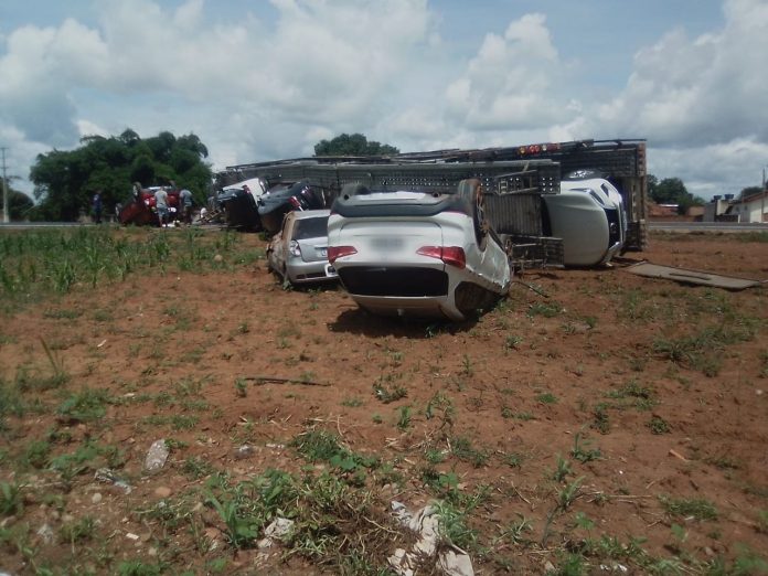 Imagens mostram fila de carros de passeio capotados em acostamento na entrada da cidade. Motorista ficou ferido e foi levado ao hospital. Caminhão-cegonha que transportava 11 veículos tomba na BR-153
