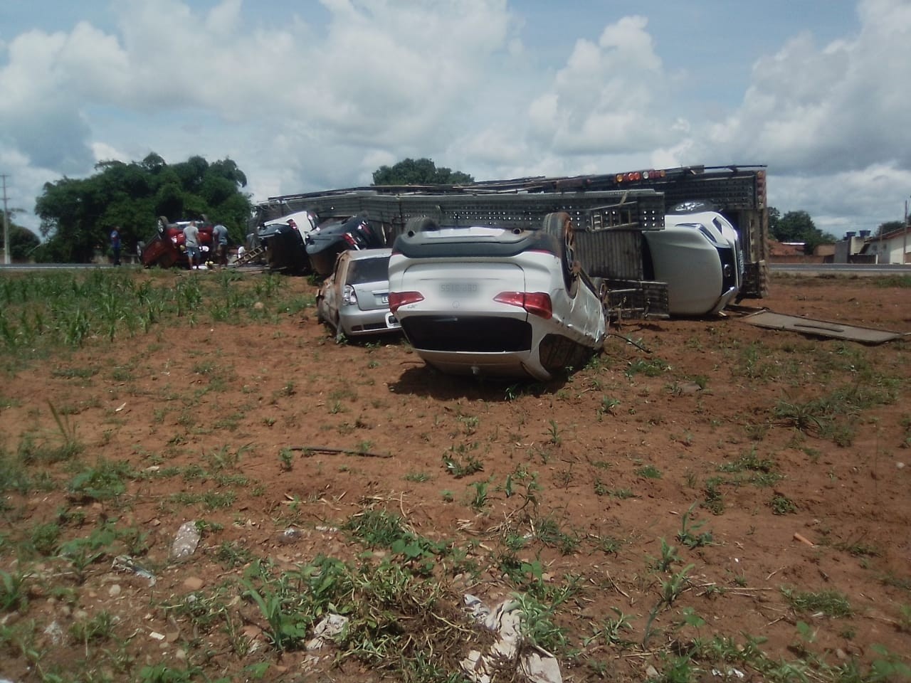 Imagens feitas no local mostram que os carros que sofreram maiores danos estavam na parte superior do caminhão. Com o impacto da queda, alguns veículos saíram da pista e ficaram destruídos.