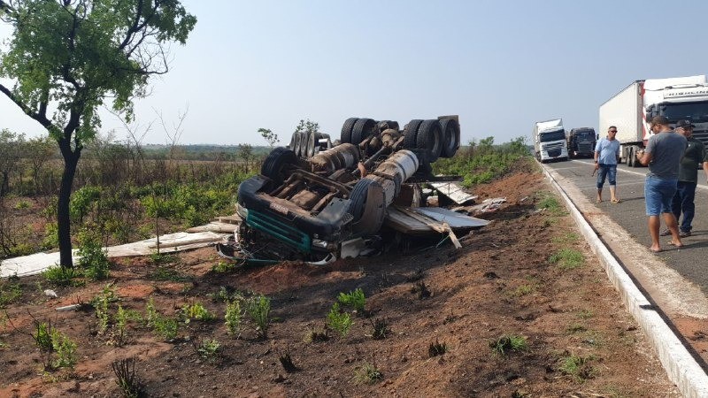 Caminhão tomba às margens da BR-153 após motorista fazer manobra e evitar batida frontal