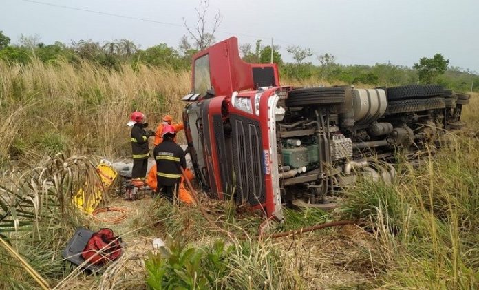 Um caminhão tombou na manhã deste sábado (10) na TO-010 entre Palmas e Lajeado, na região central do estado, após desviar de um carro que fazia ultrapassagem. Dentro do veículo de carga estavam um casal e duas crianças. A mulher acabou ficando com a perna imprensada e os Bombeiros foram chamados para fazer o resgate.