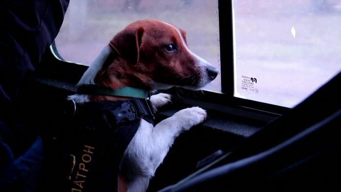 O serviço de emergência da Ucrânia divulgou um vídeo nesta segunda-feira (4) que mostra um pequeno cão farejador ajudando a detectar dispositivos explosivos deixados pelas tropas russas.