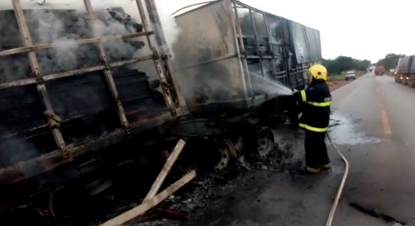 Uma carreta ficou totalmente destruída após pegar fogo neste domingo (24) na BR-153, em Tabocão. Segundo o Corpo de Bombeiros, o veículo estava carregado de madeira cerrada. Apesar do susto e do prejuízo, ninguém se feriu.