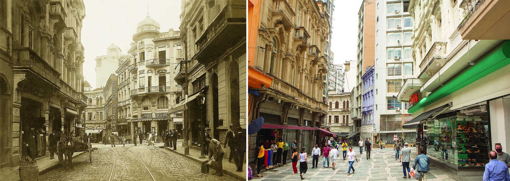 Largo São Bento, na região central de São Paulo, em foto da década de 1920 e de 2022
