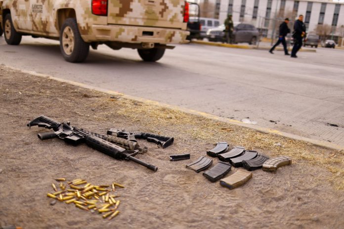 O criminoso conhecido como “El Neto” havia fugido da prisão no domingo (1º), junto com outros 29 detentos. Ele foi encontrado em uma cidade na fronteira com os Estados Unidos. Armas e balas são vistas em frente à prisão estadual de Cereso 3 protegida pelas forças de segurança depois que agressores entraram na prisão e libertaram vários presos no México em 1º de janeiro de 2023