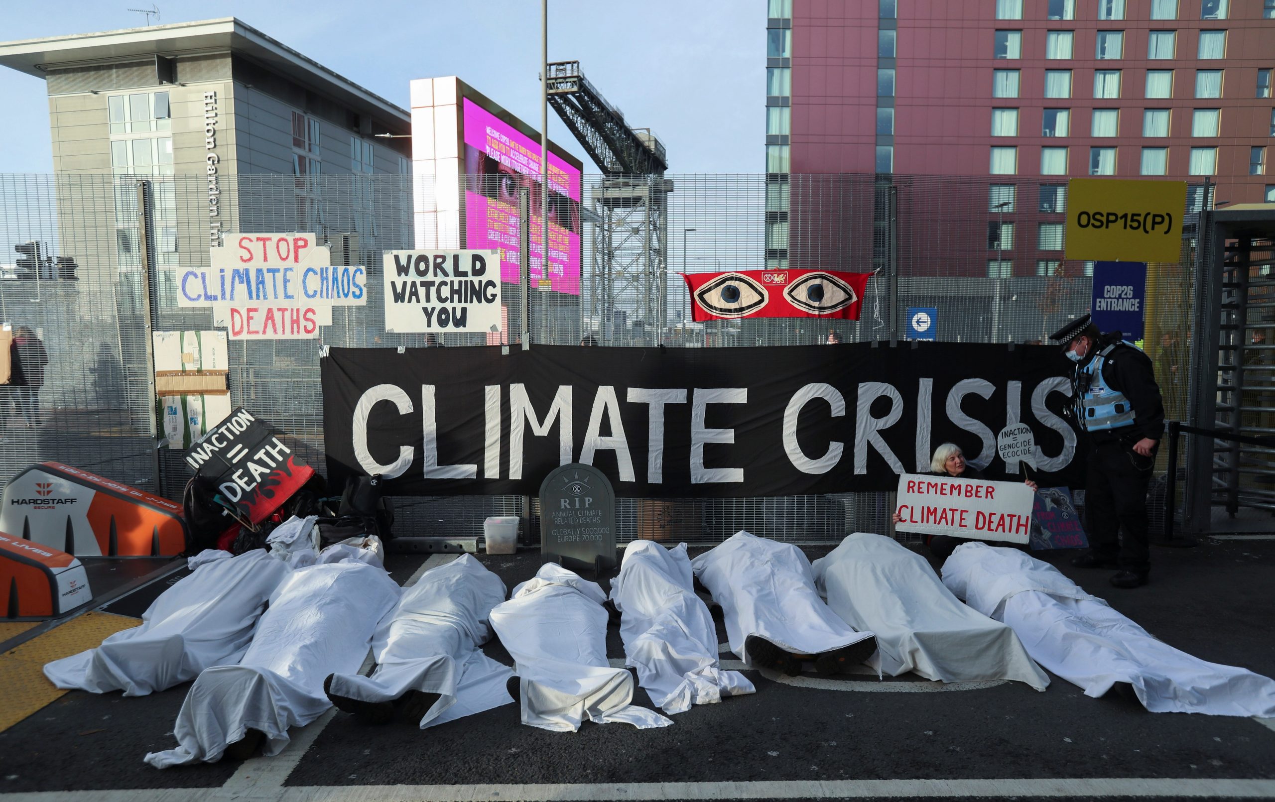Pronunciamentos ocorrem no penúltimo dia da COP26, conferência das Nações Unidas sobre mudanças climáticas que reúne quase 200 países para definir medidas de combate ao aquecimento global. Manifestantes fazem protesto sobre a crise climática do lado de fora do local da COP26 em Glasgow, na Escócia, nesta quinta-feira (11).