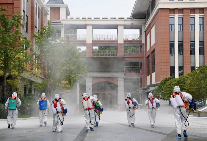 País identificou 39 novos casos da doença nas últimas 24 horas. Na semana passada, foram mais de 100. Grupo usando trajes de proteção desinfeta escola primária em 25 de agosto de 2021 em Wuhan, na China, antes de sua reabertura no próximo semestre, após surto de Covid-19 na província de Hubei